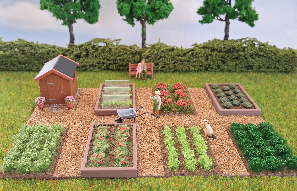 The photo shows how these patches can be combined with other items to make a large allotment scene.